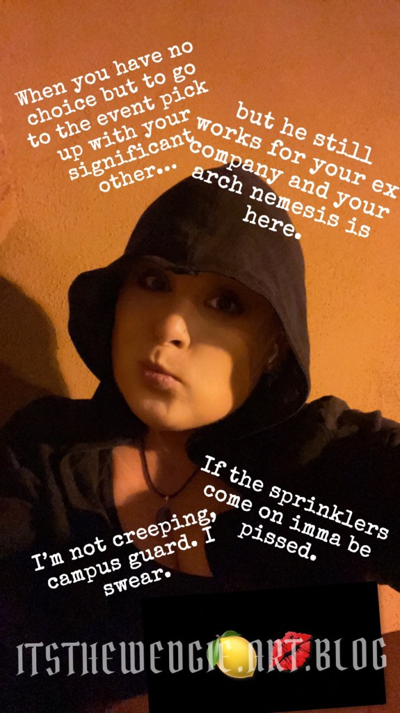 He wasn’t outside, I had to walk in where it was as awkward as ever. I sat down on the couch in the lobby, and proceeded to try to get ahold of my other half once again. Finally, I resigned myself to walk through the building. If I didn’t find him or he had already left, I had decided I would brave the half mile walk home.