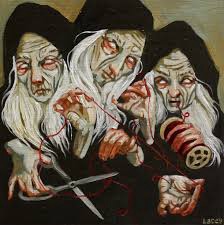 The Fates are the daughters of Nyx (Night) or Zeus and Themis (Law and Justice). They are sisters of the dark forces of the world, including: Blame, Sad Distress, Nemesis, Strife.