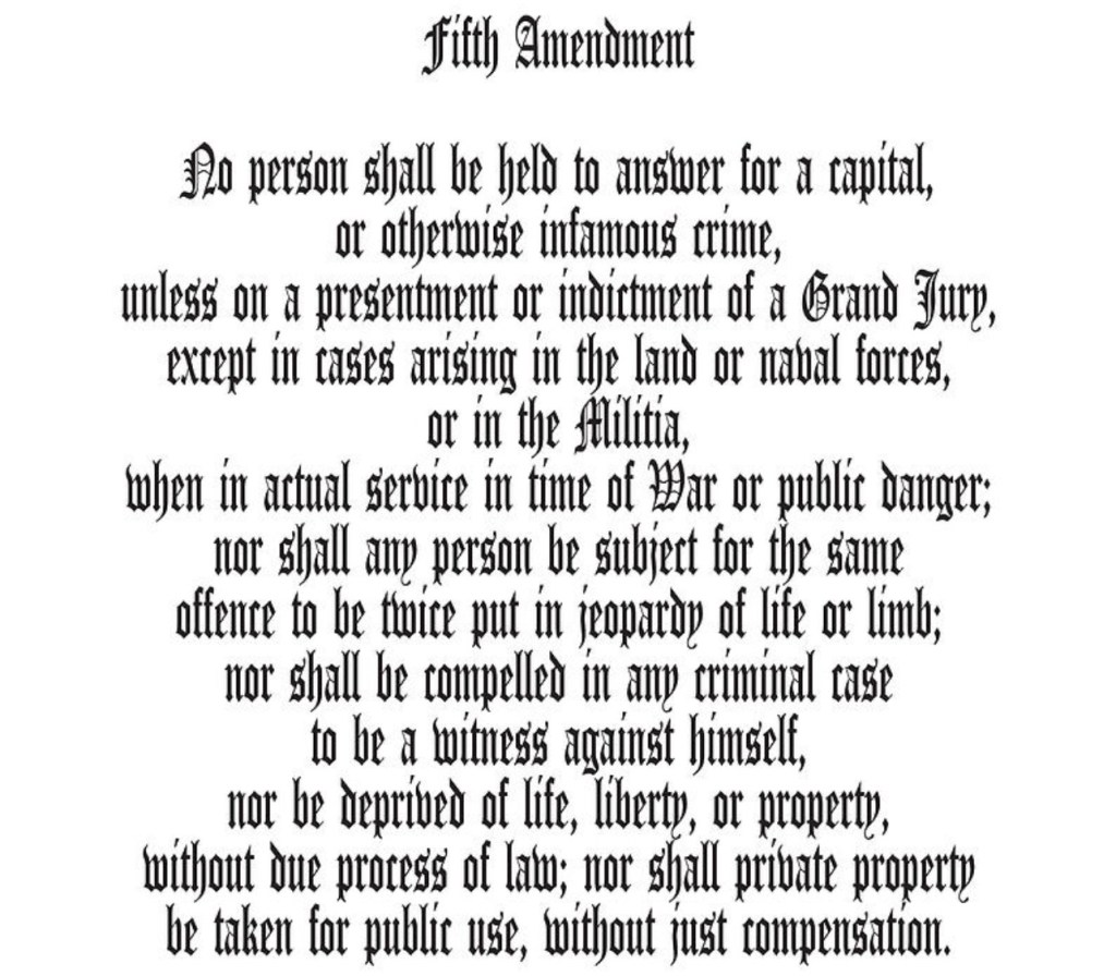 The Fifth Amendment to the United States Constitution protects individuals from being compelled to be witnesses against themselves in criminal cases. It also ensures that no person shall be deprived of life, liberty, or property, without due process of law. Additionally, it guarantees the right to a grand jury, forbids double jeopardy (being tried for the same crime twice), and protects against self-incrimination.